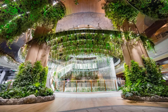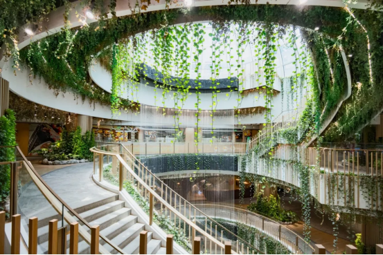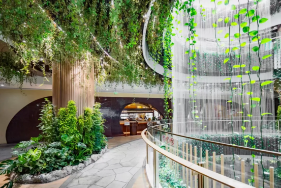 不仅如此,重庆大都会打造融合绿色生态设计的用餐区域,从8楼空中花园拾级而下,如同在山城行走,户外阳光透过玻璃穹顶倾泻而下,“瀑布”一直延伸到5楼,结合室内喷泉造景,给人一种“室内如同室外”的自然亲近感。