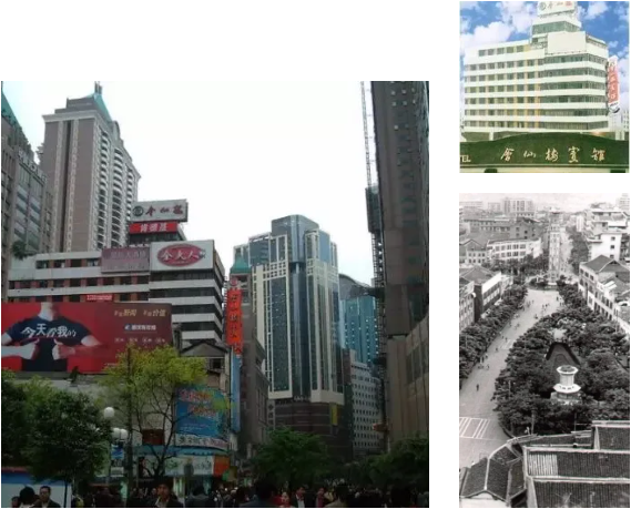 右下:上世纪80年代初从会仙楼上俯看解放碑