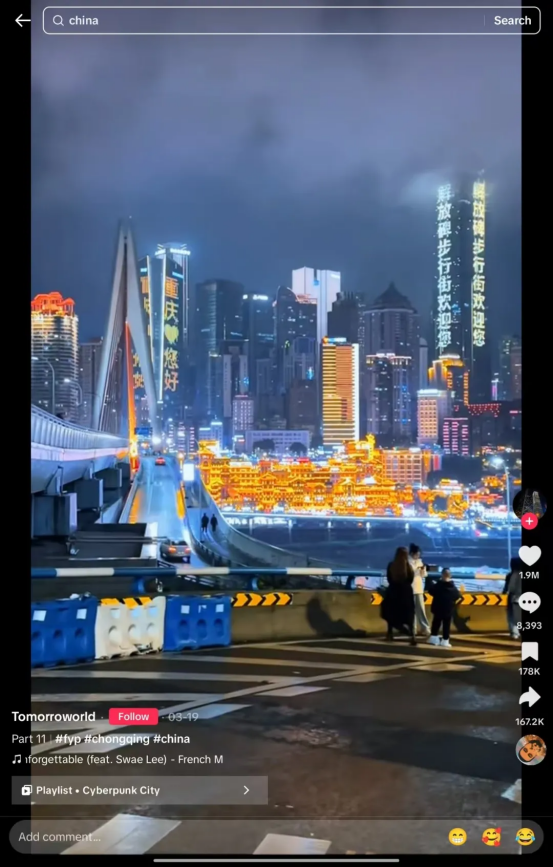TikTok上部分带#chongqing话题的视频均有可观互动量