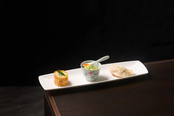 「翡翠豆腐」,是餐厅最受欢迎菜品之一,由毛豆及干贝一起磨碎炒制而成,干贝的咸香勾调出其中的鲜味,而翡翠二字则形容了这道菜的颜色,翡为红翠为绿,豆腐则是形容它的口感与呈现方式,口味鲜香,口感丰富。「鼓板大虾」,把虾肉和虾黄用猪网油及蛋皮卷好炸制而成,因形似鼓板而得名,外皮酥脆可口,内里虾仁口感弹牙鲜甜,两者相辅相成,相得益彰,是北京经典菜品之一。「番茄三鲜烫面蒸饺」,是厲家菜传人厲晓麟先生在小时候每逢节日团聚时,厲师傅的父亲厲善麟先生都会制作的一道菜品,还原了厲师傅记忆中的团圆味道。其中三鲜是指海参、虾肉及猪肉,佐以番茄及老火高汤增鲜,口味清新,爽口温润。