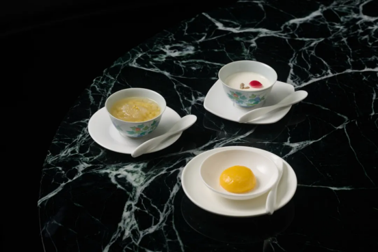 「燕窝绿豆水饭」(左)、「三不沾」(右下)及「宫廷奶酪」(右上),都是清朝御膳房里深受皇室喜爱的臻品。其中燕窝绿豆水饭,据传是皇上户外打猎時因思念白米饭口感而促成的甜點,由御厨将燕窝精心炖煮,绿豆去皮佐以梨子丁,用清凉泉水浸泡制作。燕窝滋补,入口清爽,美容养颜,饭后食用清凉爽口,是慈禧最爱的甜点之一。「三不沾」是由鸡蛋黄加入淀粉、白糖、清水並添入熟猪油翻拌618次而成,相传清朝乾隆年间,乾隆皇帝到江南巡察民情,路过安阳,当地官员向其进献了一道安阳特产“三不沾”,乾隆初尝此菜,发现它不沾筷子、牙齿、盘子,龙颜大悦,即刻下旨赐名“三不沾”,并让县令将制作方法传授给皇宫御膳房的厨师,从此这道菜便成了宫廷御膳之一。