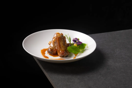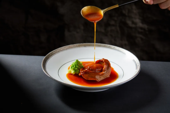 「吉品鲍」深褐色的鲍身晶莹如同琥珀,刀叉轻触间感受到肉质的弹性。一口咬下,丝滑如同太妃糖般的焦糖甜蜜,细品海潮咸鲜涌上,最是一绝的是火腿与老鸡熬煮七日的醇厚胶质收底,黏唇却不肥腻。不禁让人感叹:“不愧是香港富豪圈的硬通货!”「黑毛猪叉烧」选用西班牙伊比利亚黑毛猪的梅花肉,配以蜜汁叉烧酱烤制而成,肉质鲜嫩、紧致多汁、色泽诱人,咬一口唇齿留香,甜而不齁。