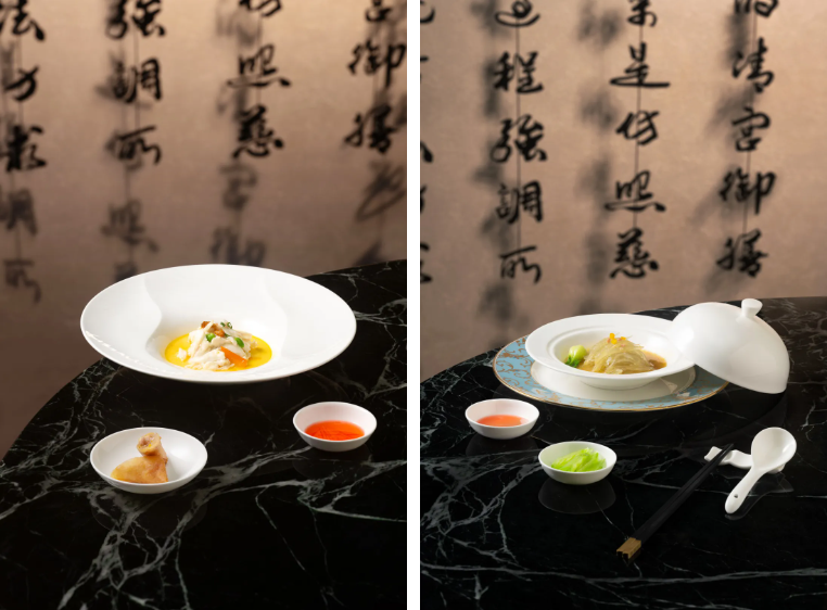 清蒸蛤什蚂烩芙蓉蟹肉(左)、黄焖鱼翅(右)