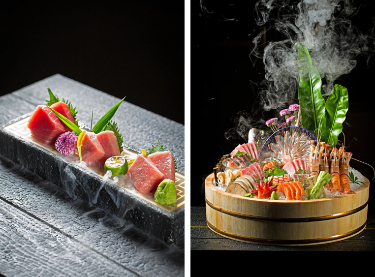 时令刺身拼盘(上)、冰鲜澳洲金枪刺身拼盘(左下)