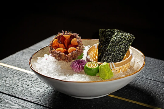 「马粪海胆」的入口感觉极为滑顺,类似丝绸般在口中化开,带来独特的口感体验,带有一种自然的甘甜味道,这种甜并非单纯的糖类甜味,而是与海胆独特的鲜味和海洋气息相互交织,味道浓郁,即使是少量的海胆黄也能在舌尖上散开,带来丰富的味觉感受,轻轻一抿,海胆肉会在口中散开,富有弹性的口感让人陶醉。