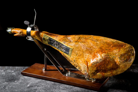 「西班牙伊比利亚带骨黑标火腿」选用100%纯种的伊比利亚黑猪肉,这些猪在广阔的草原上自由奔跑,每日步程高达14公里,并在每年12月至次年4月间享受12公斤的野生橡果盛宴,制作过程可达七年之久。黑标火腿透光如红宝石,脂肪纹路似大理石。入口是融化坚果香,细嚼渗出橡果甜韵,搭配蜜瓜的清甜恰好解腻。侍者揭秘:“这些猪每天跑半马,比健身房会员还自律!”