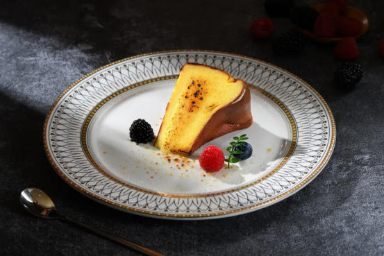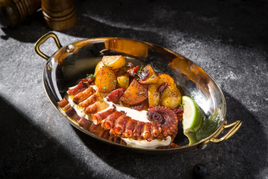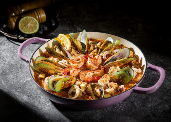 当盛满「西班牙传统海鲜饭」的黑铁锅端上桌时,藏红花染红的米粒间缀满蓝口贝、阿根廷红虾,最绝是侍者翻锅瞬间露出的金黄锅巴层。该菜品精选西班牙产艮米,其特点是小而圆、收汁能力强且久煮后米粒的中间依然能够保持硬芯不烂。数不清的大虾、贝类及鱿鱼与米一起烹煮,并佐上作料,使它们的鲜味再更上一层楼。整道饭鲜美多汁,浓郁醇厚,令人回味无穷。